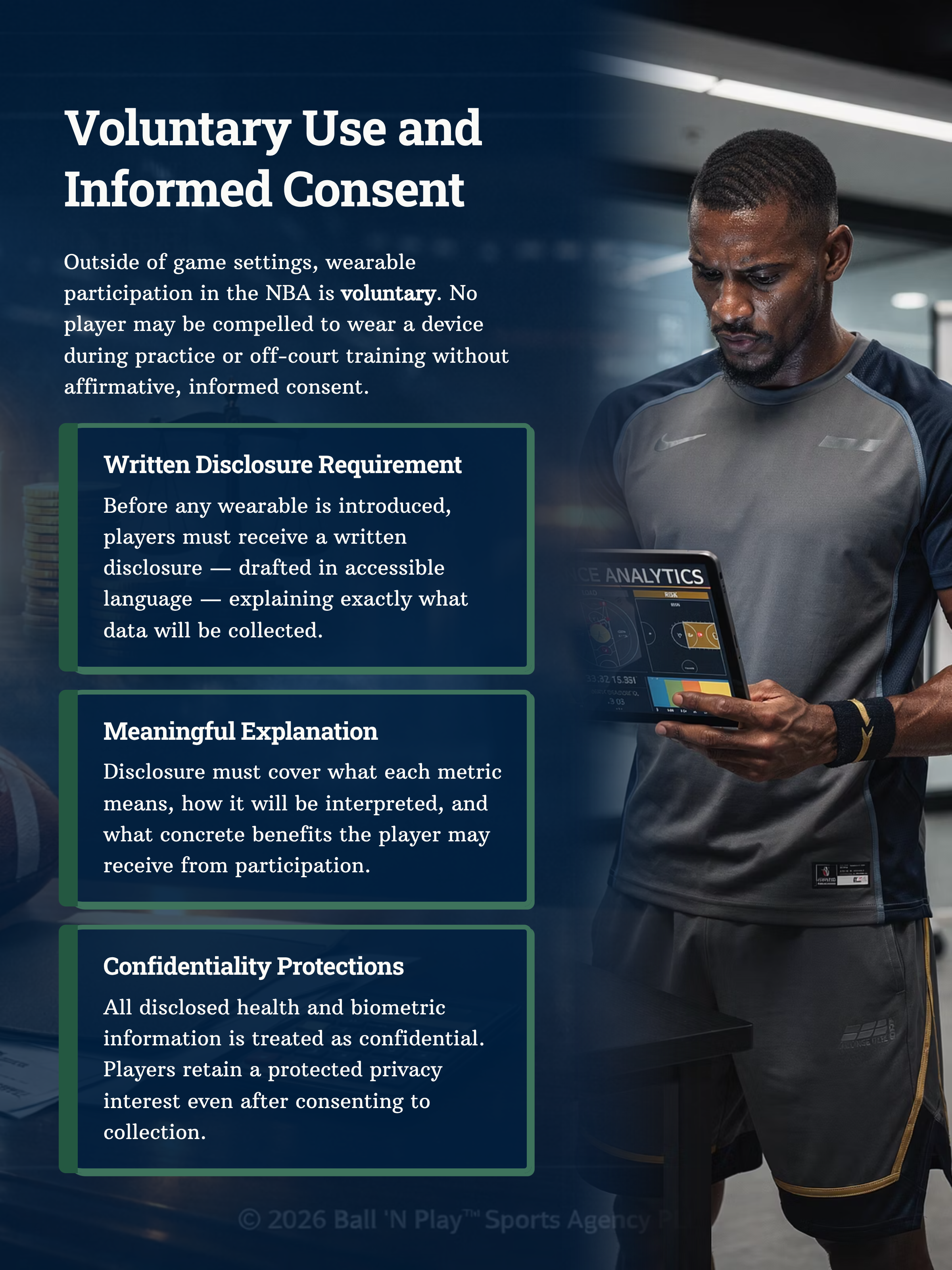 The player-protective core of the NBA’s wearable provisions appears in the voluntariness and use-restriction rules. Teams may request players to use approved wearables only on a voluntary basis in practice or other non-game settings. Players may decline to use a wearable or discontinue use at any time. Before a team can request wearable use, it must provide the player a written confidential explanation of what the device measures, what each measurement means, and the benefits to the player in obtaining the data.^5 These provisions operate as informed-consent safeguards within a workplace where formal consent is often strained by power asymmetry, roster pressure, and medical dependence.