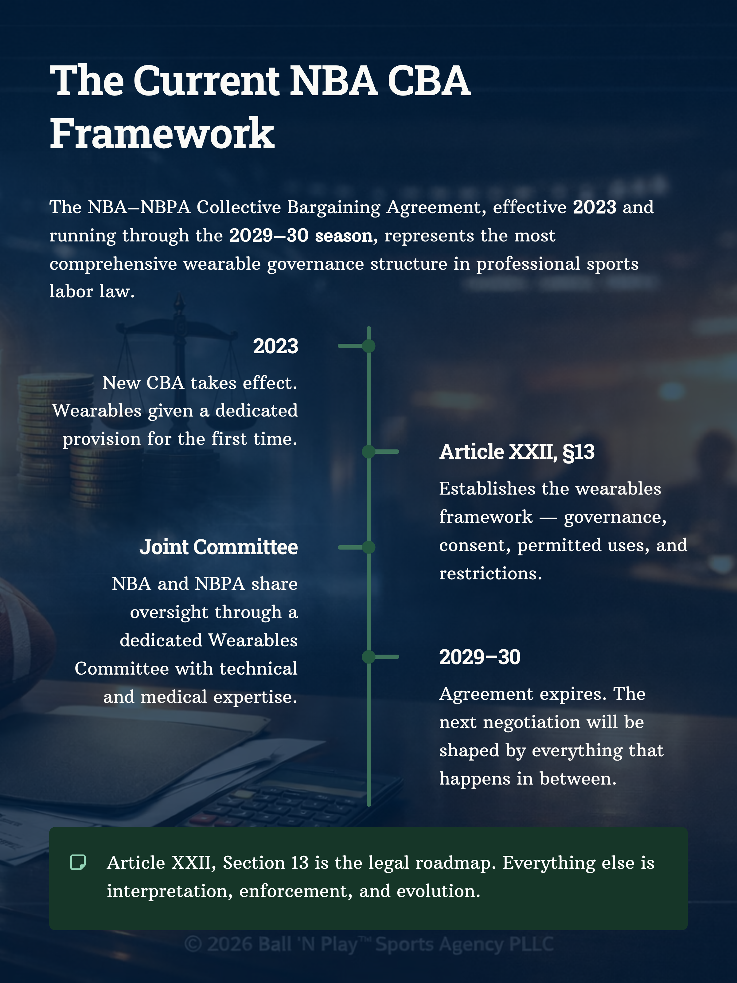 The NBA’s treatment of wearable technology has evolved from a novel bargaining issue into a meaningful model for labor-based biometric governance. Under the current NBA-NBPA Collective Bargaining Agreement, ratified in 2023 and running through the 2029-30 season unless either side opts out after the 2028-29 season, wearable technology is no longer a side issue. It is embedded in the larger architecture of player health, performance, privacy, and labor-management control over data generated by athletes’ bodies.^1
