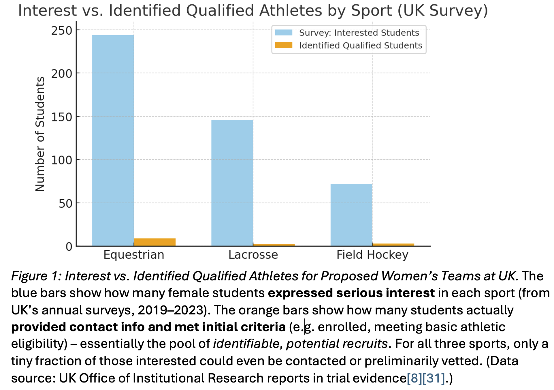 Trial testimony further cast doubt on the immediate viability of the teams. The coaches of the club teams testified about the current skill and commitment levels. According to Judge Sutton’s summary, the club lacrosse coach described participation as “very lackadaisical,” and the club field hockey team was poorly organized[33]. The equestrian club lacked high-level training opportunities, raising safety concerns about jumping straight to NCAA competition[33]. These details suggested that, while interest existed, the pipeline of talent ready for Division I competition was thin. Sutton’s opinion highlighted that at trial only one female student testified she “wanted to and could compete” in equestrian, and two for lacrosse – “far short of the numbers to field each team” in those sports[34]. Essentially, the evidence showed a wish for teams, but not a critical mass of varsity-capable players. Figure 1 below illustrates the disparity between expressed interest and identified recruits for each sport at issue, based on the survey data: