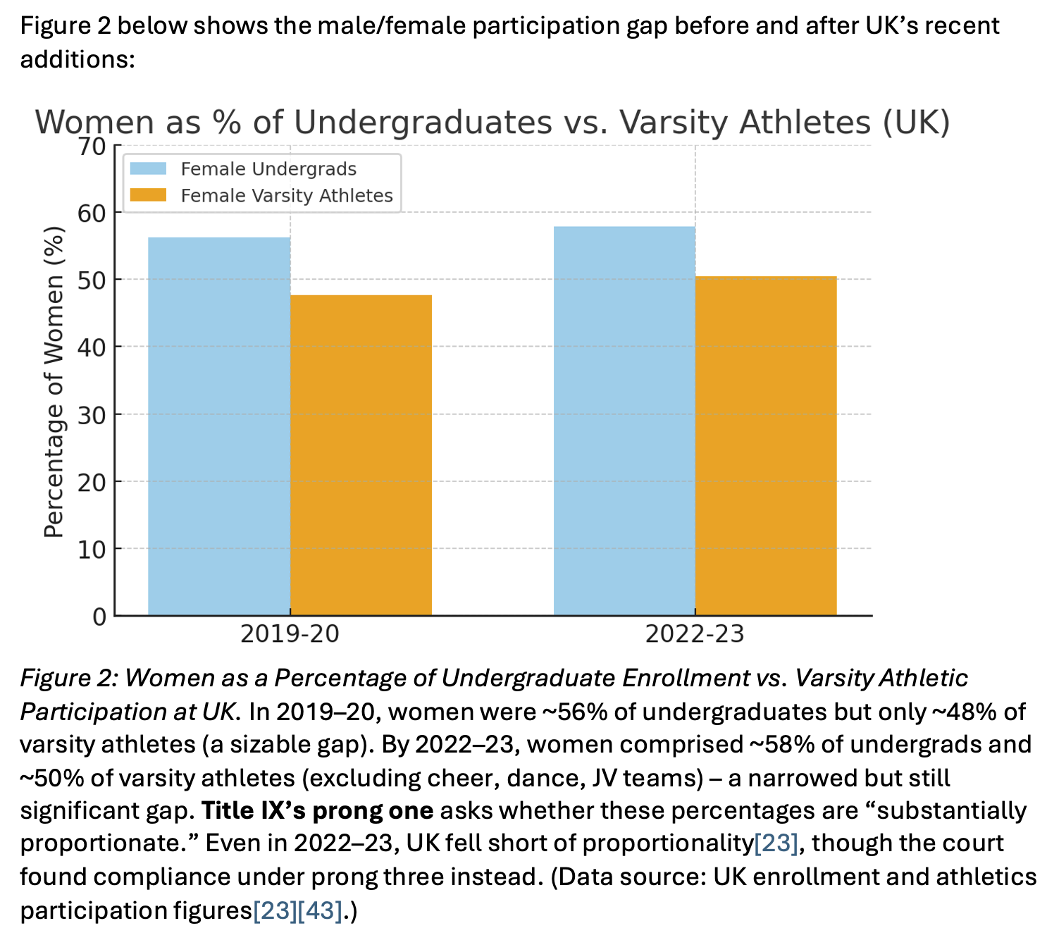 UK’s Actions: Notably, after the lawsuit was filed, UK did take steps that boosted its female athlete numbers (though these moves were controversial in the litigation). In 2020–21, UK started counting its cheerleaders and dance team members as varsity athletes, and in 2021–22 it added a women’s junior varsity (JV) soccer team (a non-NCAA team) and even a varsity “stunt” team (competitive cheer)[35][36]. These additions dramatically increased the official count of female participants, narrowing the participation gap on paper. For example, including cheer and dance, UK’s percentage of female varsity athletes jumped from ~48% in 2019 to ~54.5% in 2022[23]. However, the court was skeptical of counting those teams for Title IX. Cheerleading and dance are not recognized as varsity sports by the NCAA or the U.S. Department of Education[37][38]. And the JV soccer team, while providing additional women’s roster spots, wasn’t a full varsity program. Judge Caldwell ultimately decided not to count cheer and dance in the Title IX analysis[39][40]. Excluding them meant the female athlete percentage was only ~50% in 2022–23, leaving a gap of about 7.4 percentage points below female enrollment[39][40]. This translates to needing roughly 116 more female roster positions to reach parity[41][42].