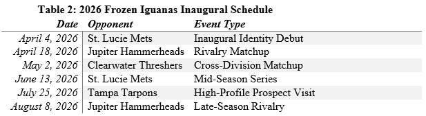 A significant development for the 2026 season is the launch of the "Palm Beach Frozen Iguanas," the first-ever alternate identity for the Palm Beach Cardinals. This rebrand, presented by the South Florida-based removal company IggyTrap, will be featured on 12 home Saturday games throughout the season. The identity is rooted in the local South Florida phenomenon where iguanas, which are cold-blooded reptiles, enter a dormant, "frozen" state and fall from palm trees when temperatures drop below 50 degrees Fahrenheit.