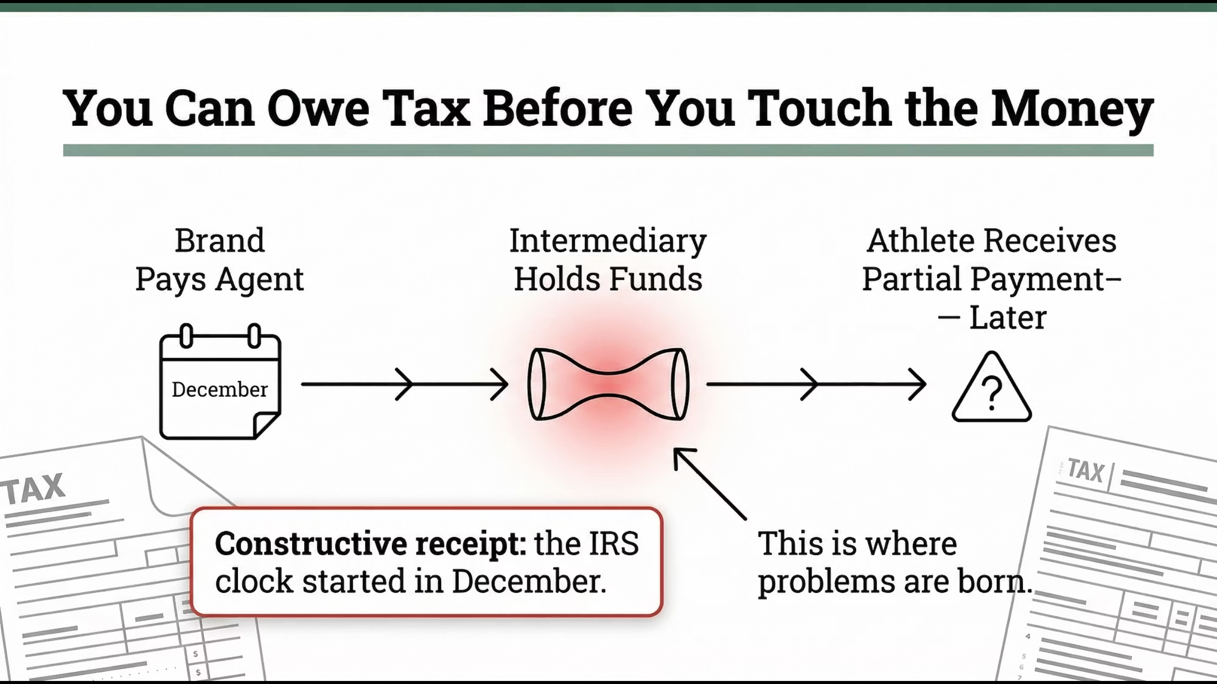 One of the most dangerous misconceptions in the NIL ecosystem is the belief that tax liability is deferred until income is physically deposited into the athlete's personal bank account. The IRS doctrine of "constructive receipt" dictates that income is taxable in the year it is made available to the taxpayer without substantial limitation or restriction, regardless of whether it is in their physical possession.