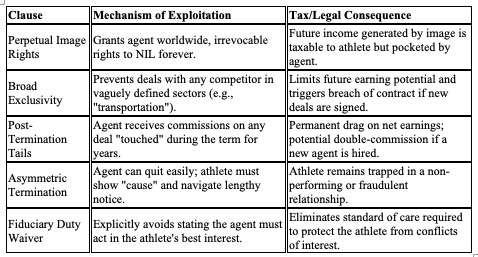 The rapid deregulation of collegiate athletics has allowed for the proliferation of unregulated agents who may utilize predatory contract terms to exploit the gap between an athlete's market value and their tax sophistication. These intermediaries often use the complexity of tax law to conceal earnings or shift financial risks onto the athlete.
