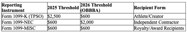 The reduction of the 1099-K threshold to $600 in 2026 ensures that even micro-influencers and collegiate athletes with modest endorsements are captured within the IRS’s automated data-matching systems. Furthermore, any NIL deal valued at $600 or more must be vetted and reported to the College Sports Commission (CSC) via the NIL Go platform to ensure the transaction has a legitimate business purpose and does not constitute "pay-to-play".