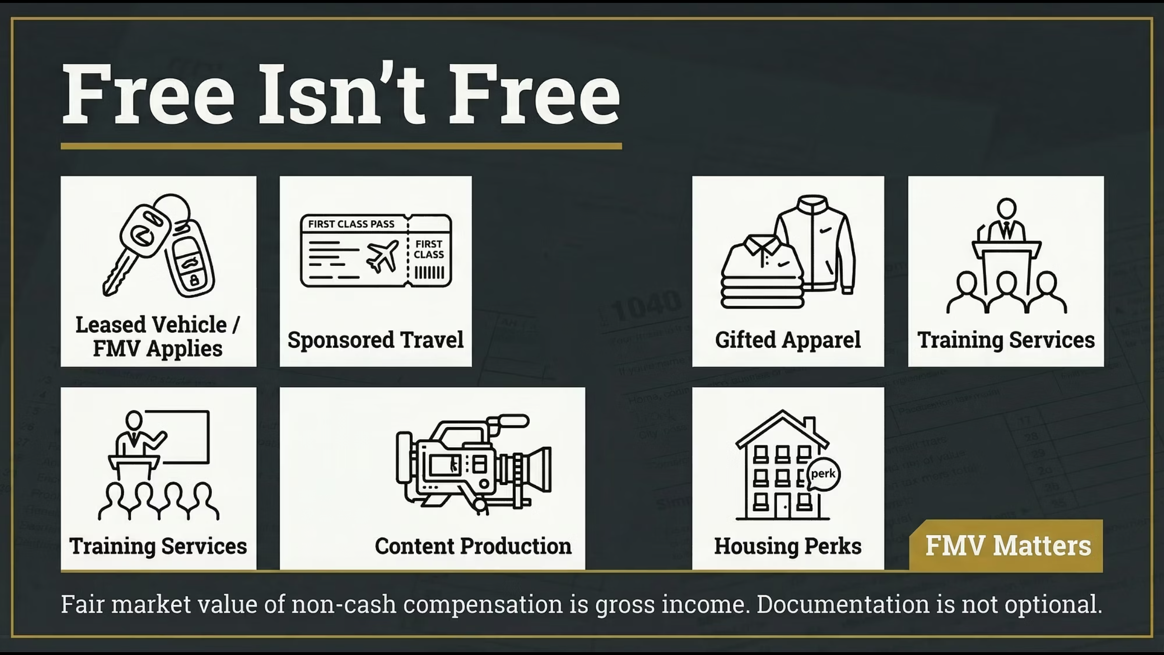 The IRS has signaled that it is increasingly focused on non-cash NIL compensation, which is frequently overlooked by young athletes. These benefits, which include free apparel, luxury vehicle leases, complimentary travel, and high-performance training services, are taxable at their fair market value (FMV).